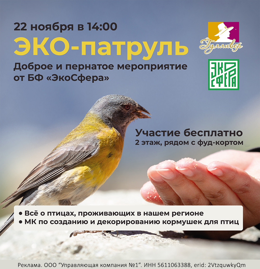 Реклама. ООО “Управляющая компания №1”. ИНН 5611063388, erid: 2VtzquwkyQmПриглашаем всех на наш ЭКО-патруль в Гулливере